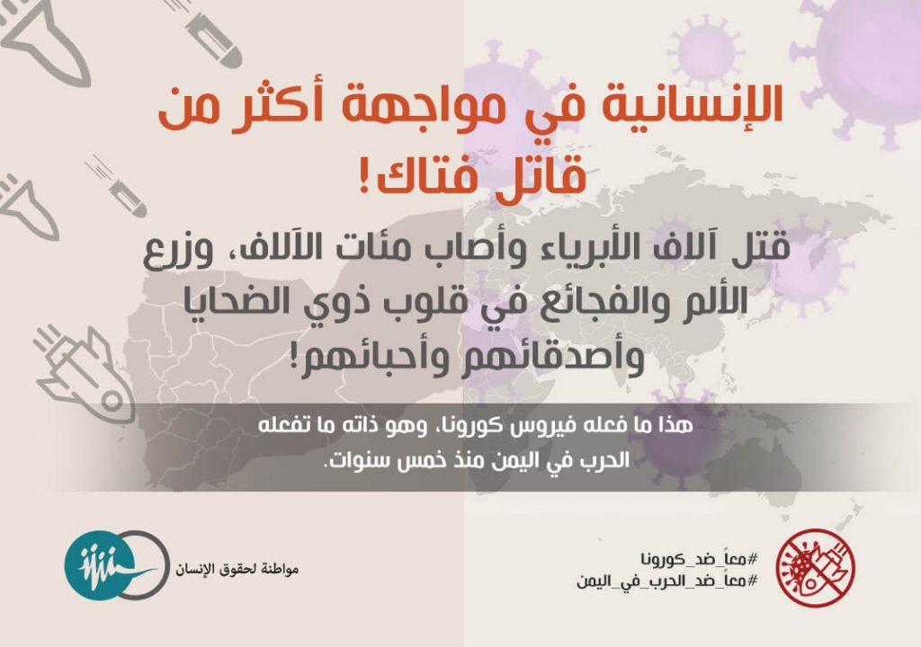 نثمن كل تضامن ضد الحرب في اليمن وكل الحروب الأخرى. ونعتبرها مناسبة الآن لمضاعفة الجهود ورفع الوعي بكل ما يقتل الإنسان ويتربص بحياته وأمانه وسلامته، سواء كان فيروساً أو أسلحة قديمة أو حديثة محمية بحزمة من المصالح والسياسات الخاطئة!