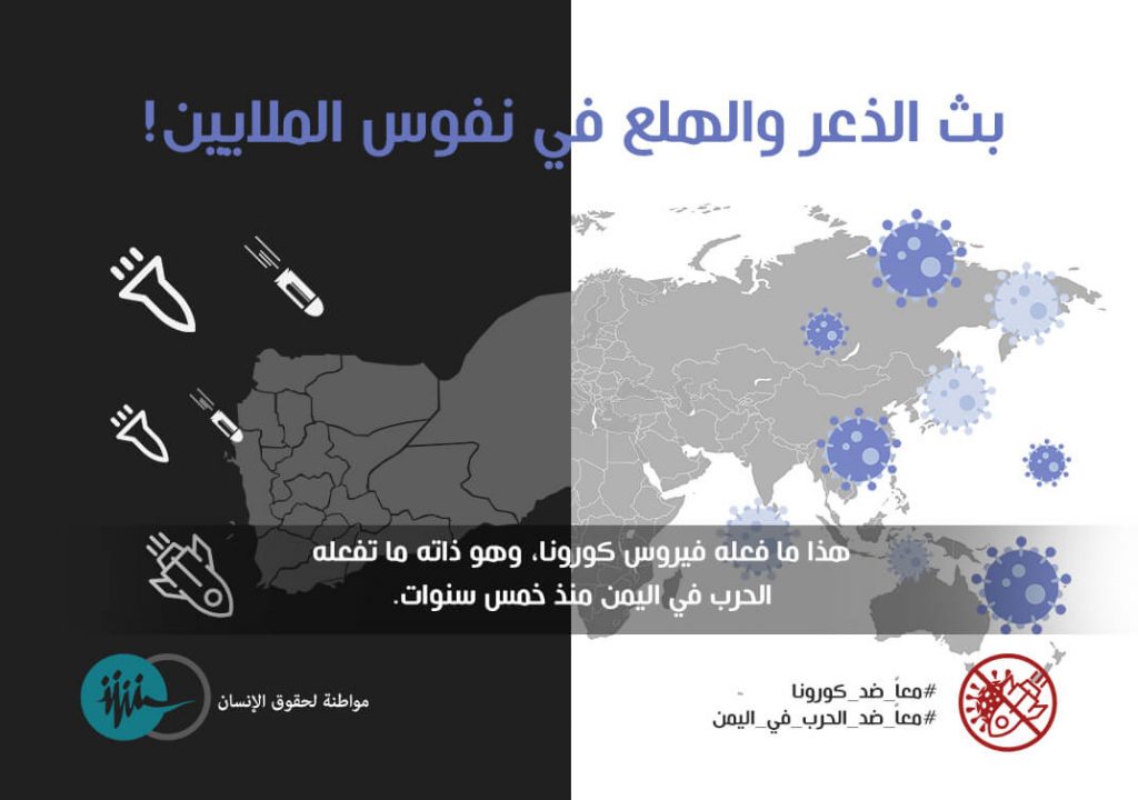 ومع تضامننا الكامل وصلواتنا لأجل الإنسانية، نُذكر بأن الحرب فعلت باليمن واليمنيين كما فعل هذا الفيروس بالعالم. بمساهمة وتواطؤ من ذات الحكومات والإدارات التي تُصنع أحدث الأسلحة وتصدرها لأطراف الحرب في اليمن، عرف المدنيون والمدنيات في اليمن أحدث الأسلحة وأكثرها تخلفاً والتي اقتحمت حياتهم، منازلهم وأسواقهم وأعراسهم ومجالس عزائهم وتاريخهم. عرفوا هذه الأسلحة قبل أن يعرفوا أحدث ما أنتجته الحضارة الإنسانية في الطب والتعليم والنقل والإنتاج والإعمار والترفيه، بسبب ذات السياسات لذات الحكومات والقادة الذين جعلوا المجتمعات في أوج تقدمها ضعيفة في مواجهة فيروس فتاك.
