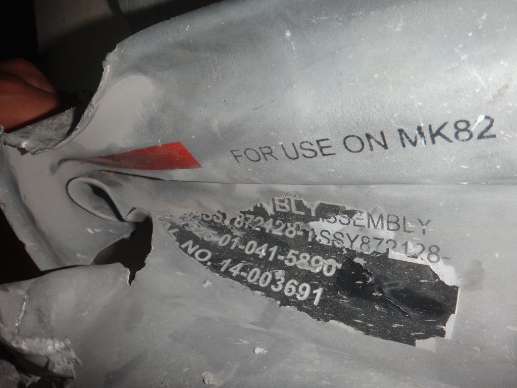 وجد فريق “مواطنة” بقايا ذيل قنبلة في موقع القصف. ووفقاً لخبراء الأسلحة المكلفين من قبل “مواطنة”، تنتمي البقايا إلى قنبلة مصنّعة في الولايات المتحدة (من طراز جي بي يو 12 GBU-12 أو طراز جي بي يو GBU آخر). وشملت صفقة الأسلحة التي أبرمتها السعودية بقيمة 1.29 مليار دولار مع الحكومة الأمريكية في العام[9]2015 هذا النوع من القنابل.