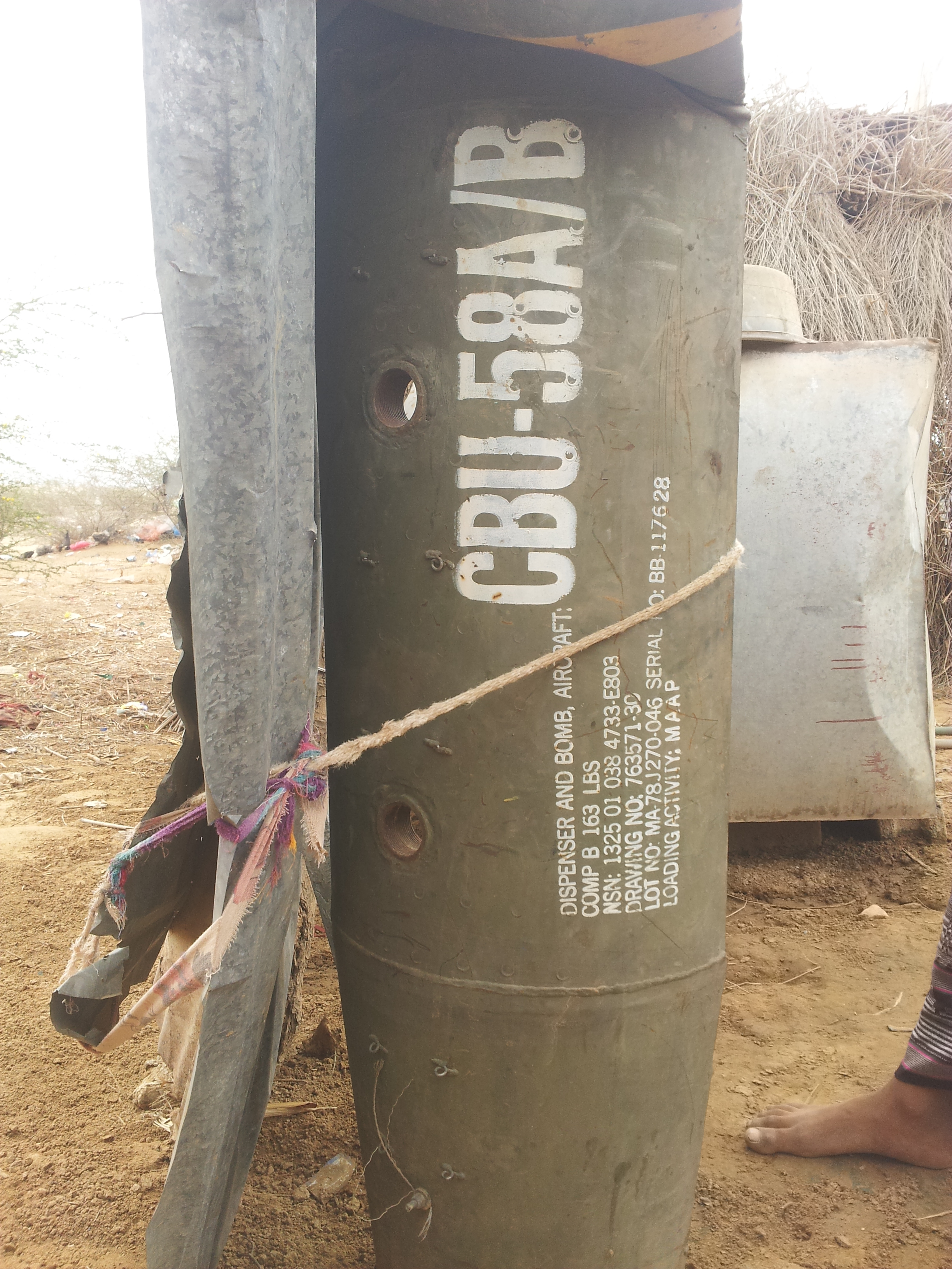وجد باحثون من “مواطنة” في الموقع، غلافاً خارجياً لوحدة قنابل عنقودية من طراز (CBU-58A/B Rockeye) أميركية الصنع. ووفقاً لمحللي الأسلحة، يحتوي الغلاف الخارجي عادةً على 630 وحدة قنابل فرعية من طراز BLU-63 تتفرق على نطاق واسع وبلا تمييز. هذه القنابل الكروية المصنوعة من الألمنيوم، و المبطنة بطبقة فولاذية قابلة للتشظي لتزيد من إلحاق الضرر بالهدف وتدمره. وفقاً لاستطلاع هيومن رايتس ووتش الخاص بالسياسات والممارسات المرتبطة بالذخائر العنقودية[7]، فقد قامت الولايات المتحدة بتصدير 1000 قنبلة عنقودية من هذا النوع إلى السعودية بين العام 1970 والعام 1995.